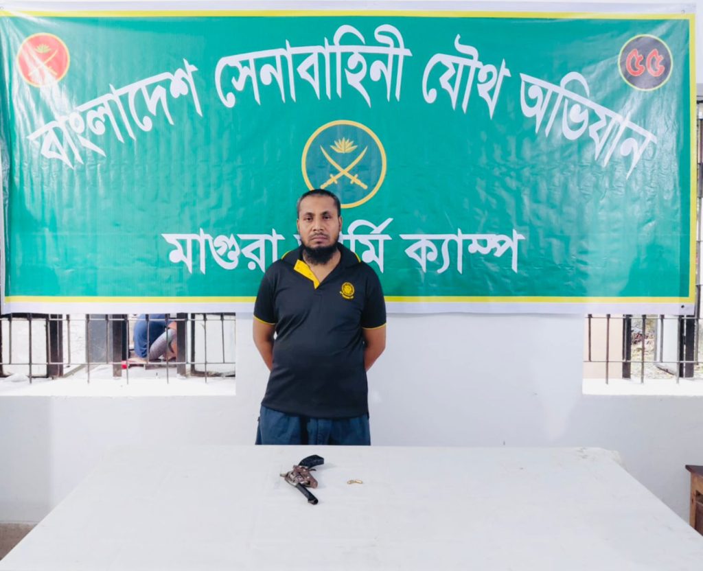 মাগুরার শ্রীপুর উপজেলায় বিশেষ অভিযান চালিয়ে আগ্নেয়াস্ত্রসহ মোহাম্মদ রফিকুল ইসলাম (৩৫) নামে একজনকে আটক করেছে সেনাবাহিনী বাহিনী। তিনি উপজেলার আমতৈল গ্রামের শহিদুল ইসলামের ছেলে।