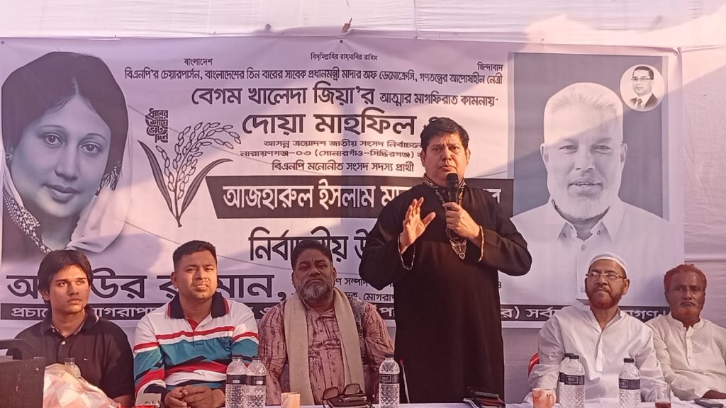 সোনারগাঁওয়ে বেগম খালেদা জিয়ার আত্মার মাগফিরাত কামনায় দোয়া ও মিলাদ মাহফিল এবং আসন্ন ১২ ফেব্রুয়ারি অনুষ্ঠিতব্য ত্রয়োদশ জাতীয় সংসদ নির্বাচন উপলক্ষে নারায়ণগঞ্জ-৩ (সোনারগাঁও – সিদ্ধিরগঞ্জ) আসনের বিএনপি মনোনীত ধানের শীষের এমপি প্রার্থী আজহারুল ইসলাম মান্নানের নির্বাচনী উঠান বৈঠক অনুষ্ঠিত হয়েছে।