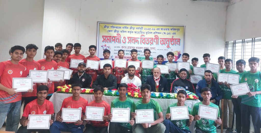 ক্রীড়া পরিদপ্তরের বার্ষিক ক্রীড়া কর্মসূচি ২০২৫-২৬-এর আওতায় জেলা ক্রীড়া অফিস ফরিদপুর কর্তৃক আয়োজিত অনূর্ধ্ব-১৫ ফুটবল প্রশিক্ষণের সমাপনী ও সনদ বিতরণী অনুষ্ঠান অনুষ্ঠিত হয়েছে।